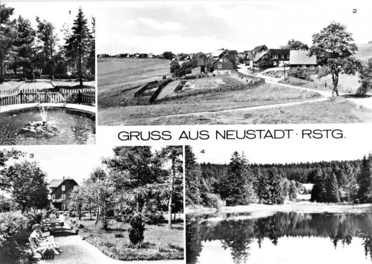Ansichtskarte Neustadt Rstg. vier Abb., - Park (2), Gesamtansicht, Höllteich Erhaltung I-II ungelaufen Druckvermerk: 1981 Herstellungsland: DDR Verlag: Bild und Heimat, Reichenbach i. V. - 01 11 03 425