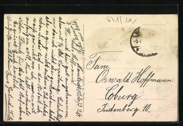 Personenbezogene Daten auf der Rückseite der Karte wurden durch blauen Textmarker unkenntlich gemacht. Die blauen Stellen sind auf die Vorderseite durchgeweicht und wirken sich negativ auf das Postkartenfoto aus