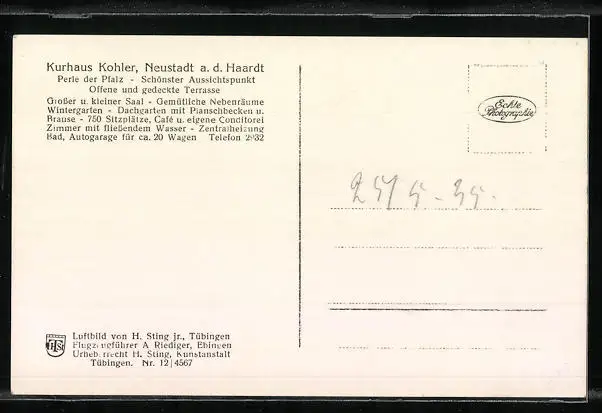 AK Neustadt a. d. H., Fliegeraufnahme des Kurhotels Köhler