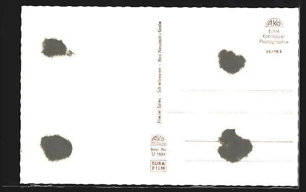 Personenbezogene Daten auf der Rückseite der Karte wurden durch blauen Textmarker unkenntlich gemacht. Die blauen Stellen sind auf die Vorderseite durchgeweicht und wirken sich negativ auf das Postkartenfoto aus