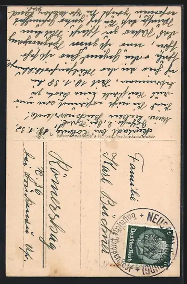 Personenbezogene Daten auf der Rückseite der Karte wurden durch blauen Textmarker unkenntlich gemacht. Die blauen Stellen sind auf die Vorderseite durchgeweicht und wirken sich negativ auf das Postkartenfoto aus