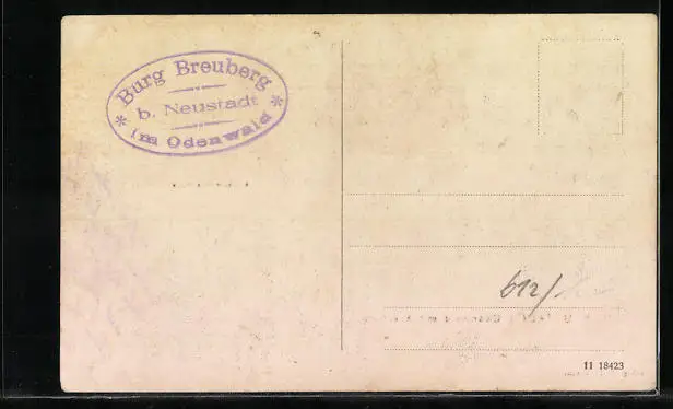Personenbezogene Daten auf der Rückseite der Karte wurden durch blauen Textmarker unkenntlich gemacht. Die blauen Stellen sind auf die Vorderseite durchgeweicht und wirken sich negativ auf das Postkartenfoto aus