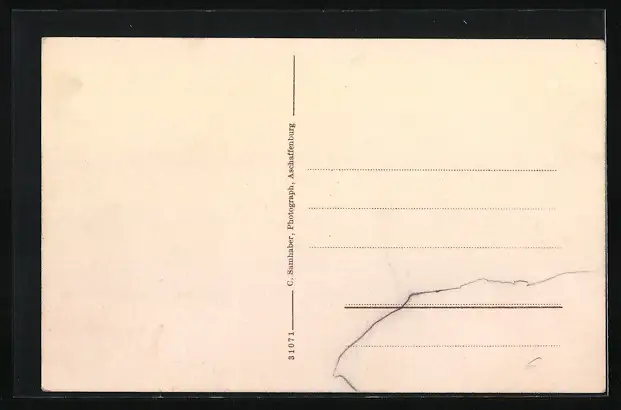 Personenbezogene Daten auf der Rückseite der Karte wurden durch blauen Textmarker unkenntlich gemacht. Die blauen Stellen sind auf die Vorderseite durchgeweicht und wirken sich negativ auf das Postkartenfoto aus