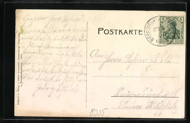 Personenbezogene Daten auf der Rückseite der Karte wurden durch blauen Textmarker unkenntlich gemacht. Die blauen Stellen sind auf die Vorderseite durchgeweicht und wirken sich negativ auf das Postkartenfoto aus