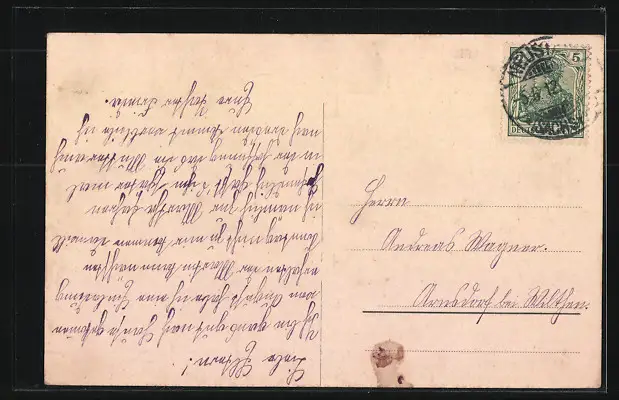 Personenbezogene Daten auf der Rückseite der Karte wurden durch blauen Textmarker unkenntlich gemacht. Die blauen Stellen sind auf die Vorderseite durchgeweicht und wirken sich negativ auf das Postkartenfoto aus