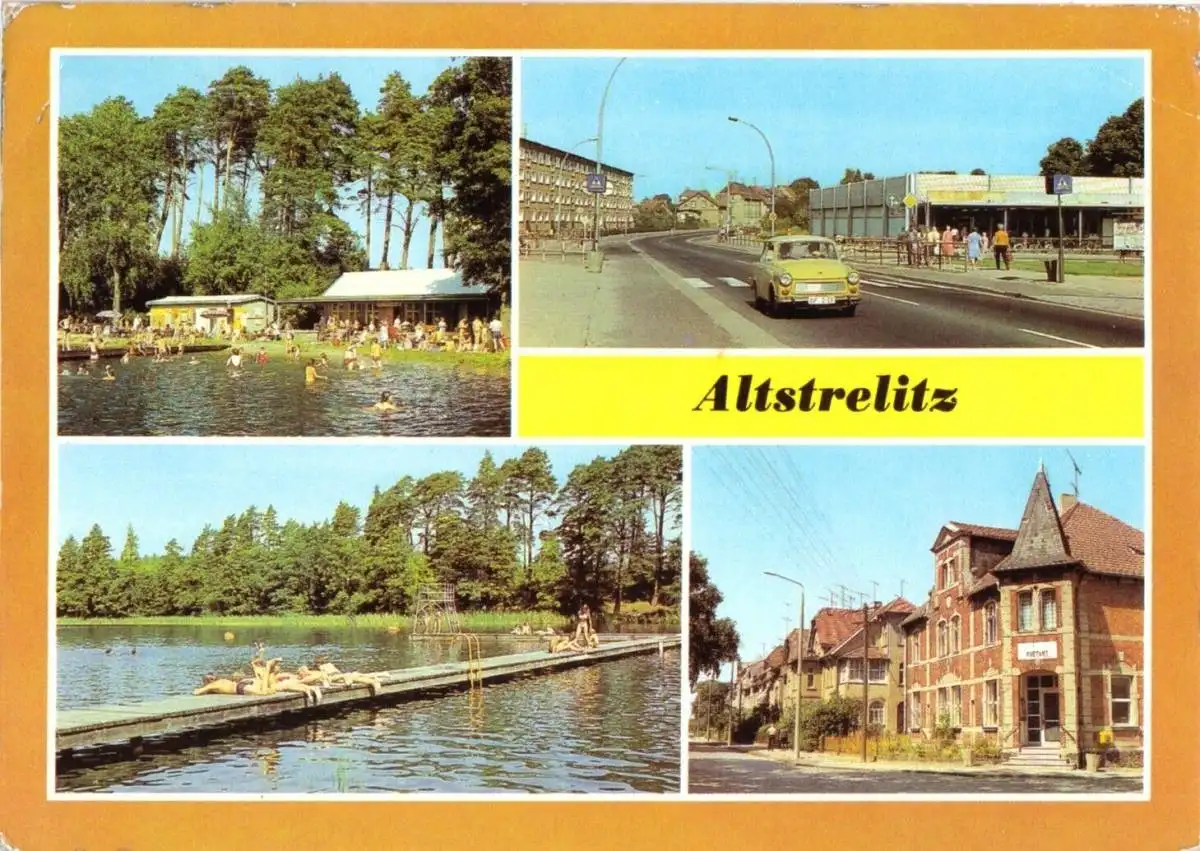 Ansichtskarte Neustrelitz, OT Altstrelitz vier Abb. - Gaststätte am Domjüchsee, Wilhelm-Pieck-Str., Domjüchsee, Bahnhofstr. Erhaltung I-II, Beförderungsspuren postalisch gelaufen, gestempelt: Neustrelitz, 11.8.85 Druckvermerk: 1984 Herstellungsland: DDR Verlag: Bild und Heimat, Reichenbach i. V. - 01 03 0254/06