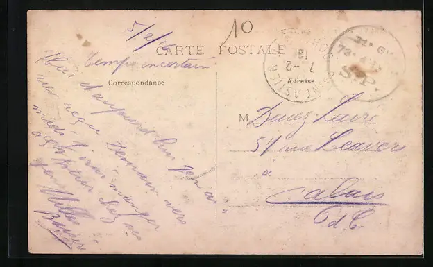 Personenbezogene Daten auf der Rückseite der Karte wurden durch blauen Textmarker unkenntlich gemacht. Die blauen Stellen sind auf die Vorderseite durchgeweicht und wirken sich negativ auf das Postkartenfoto aus