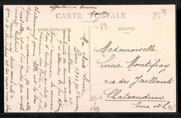 Personenbezogene Daten auf der Rückseite der Karte wurden durch blauen Textmarker unkenntlich gemacht. Die blauen Stellen sind auf die Vorderseite durchgeweicht und wirken sich negativ auf das Postkartenfoto aus