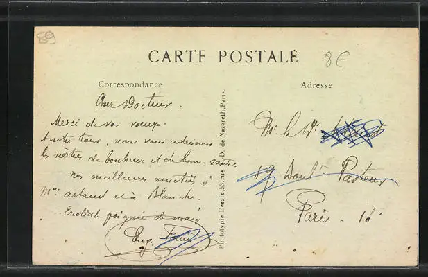 Personenbezogene Daten auf der Rückseite der Karte wurden durch blauen Textmarker unkenntlich gemacht. Die blauen Stellen sind auf die Vorderseite durchgeweicht und wirken sich negativ auf das Postkartenfoto aus