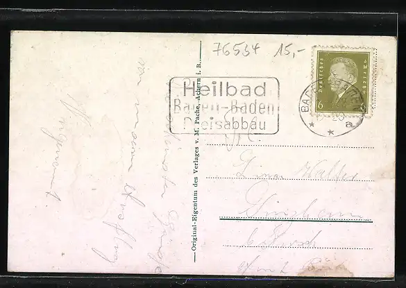 Personenbezogene Daten auf der Rückseite der Karte wurden durch blauen Textmarker unkenntlich gemacht. Die blauen Stellen sind auf die Vorderseite durchgeweicht und wirken sich negativ auf das Postkartenfoto aus