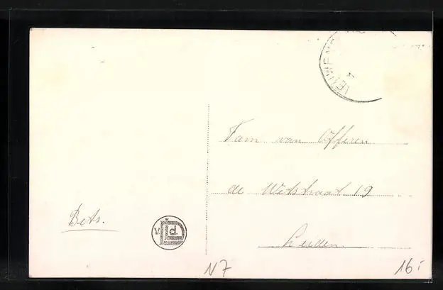 Personenbezogene Daten auf der Rückseite der Karte wurden durch blauen Textmarker unkenntlich gemacht. Die blauen Stellen sind auf die Vorderseite durchgeweicht und wirken sich negativ auf das Postkartenfoto aus