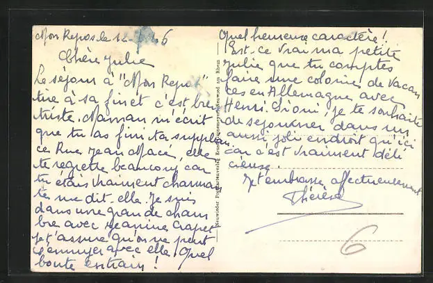 Personenbezogene Daten auf der Rückseite der Karte wurden durch blauen Textmarker unkenntlich gemacht. Die blauen Stellen sind auf die Vorderseite durchgeweicht und wirken sich negativ auf das Postkartenfoto aus
