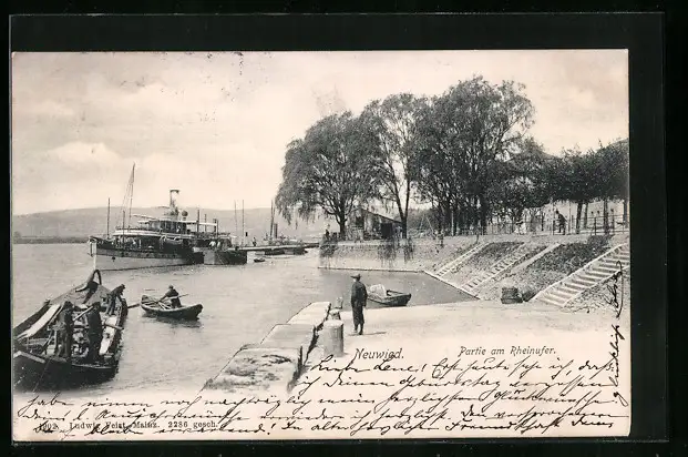 AK Neuwied, Partie am Rheinufer, Dampfer an der Anlegestelle