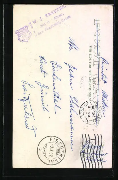 Personenbezogene Daten auf der Rückseite der Karte wurden durch blauen Textmarker unkenntlich gemacht. Die blauen Stellen sind auf die Vorderseite durchgeweicht und wirken sich negativ auf das Postkartenfoto aus