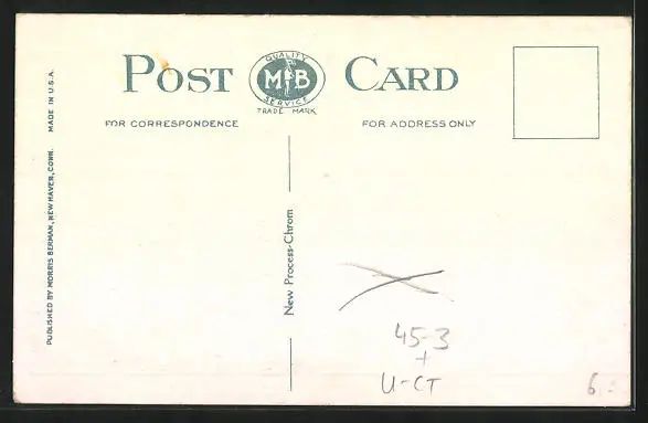 Personenbezogene Daten auf der Rückseite der Karte wurden durch blauen Textmarker unkenntlich gemacht. Die blauen Stellen sind auf die Vorderseite durchgeweicht und wirken sich negativ auf das Postkartenfoto aus