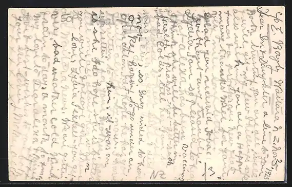 Personenbezogene Daten auf der Rückseite der Karte wurden durch blauen Textmarker unkenntlich gemacht. Die blauen Stellen sind auf die Vorderseite durchgeweicht und wirken sich negativ auf das Postkartenfoto aus