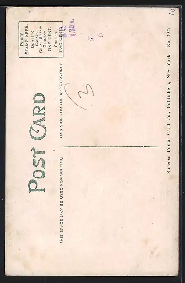 Personenbezogene Daten auf der Rückseite der Karte wurden durch blauen Textmarker unkenntlich gemacht. Die blauen Stellen sind auf die Vorderseite durchgeweicht und wirken sich negativ auf das Postkartenfoto aus