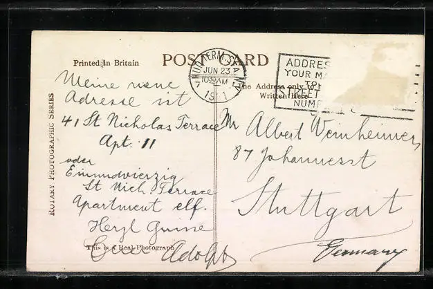Personenbezogene Daten auf der Rückseite der Karte wurden durch blauen Textmarker unkenntlich gemacht. Die blauen Stellen sind auf die Vorderseite durchgeweicht und wirken sich negativ auf das Postkartenfoto aus