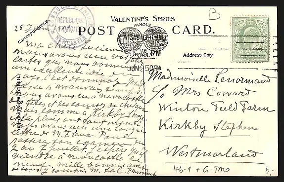 Personenbezogene Daten auf der Rückseite der Karte wurden durch blauen Textmarker unkenntlich gemacht. Die blauen Stellen sind auf die Vorderseite durchgeweicht und wirken sich negativ auf das Postkartenfoto aus