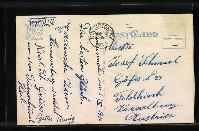 Personenbezogene Daten auf der Rückseite der Karte wurden durch blauen Textmarker unkenntlich gemacht. Die blauen Stellen sind auf die Vorderseite durchgeweicht und wirken sich negativ auf das Postkartenfoto aus