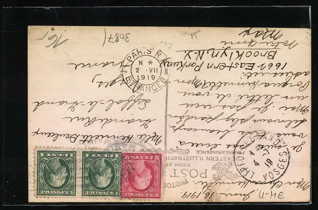 Personenbezogene Daten auf der Rückseite der Karte wurden durch blauen Textmarker unkenntlich gemacht. Die blauen Stellen sind auf die Vorderseite durchgeweicht und wirken sich negativ auf das Postkartenfoto aus