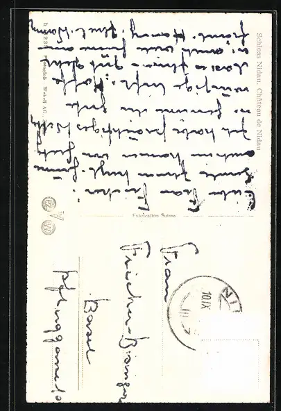 Personenbezogene Daten auf der Rückseite der Karte wurden durch blauen Textmarker unkenntlich gemacht. Die blauen Stellen sind auf die Vorderseite durchgeweicht und wirken sich negativ auf das Postkartenfoto aus