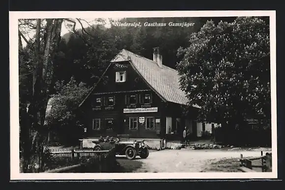 AK Niederalpl, Gasthaus und Touristenheim Gamsjäger, Automobil