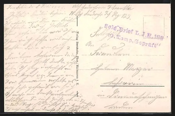 Personenbezogene Daten auf der Rückseite der Karte wurden durch blauen Textmarker unkenntlich gemacht. Die blauen Stellen sind auf die Vorderseite durchgeweicht und wirken sich negativ auf das Postkartenfoto aus