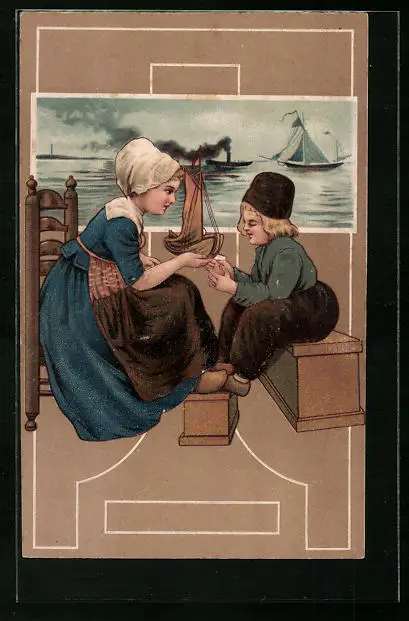 AK Niederländerin und Junge mit Spielzeugboot, Im Hintergrund Dampfer und Segelboote auf See