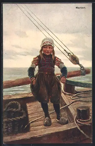 AK Niederländische Trachten, Junges Mädchen auf einem Segelboot