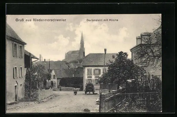 AK Niedermorschweiler, Strassenpartie mit Blick zur Kirche