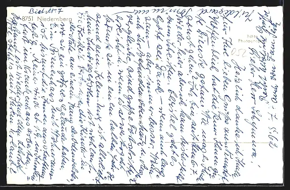 Personenbezogene Daten auf der Rückseite der Karte wurden durch blauen Textmarker unkenntlich gemacht. Die blauen Stellen sind auf die Vorderseite durchgeweicht und wirken sich negativ auf das Postkartenfoto aus