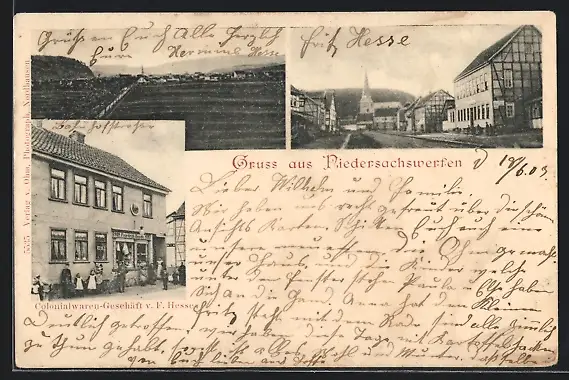 AK Niedersachswerfen, Kolonialwaren-Geschäft v. F. Hesse, Strassenpartie mit Kirche, Teilansicht