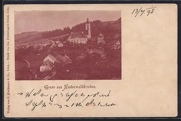 AK Niederwaldkirchen, Totalansicht mit Kirche aus der Vogelschau