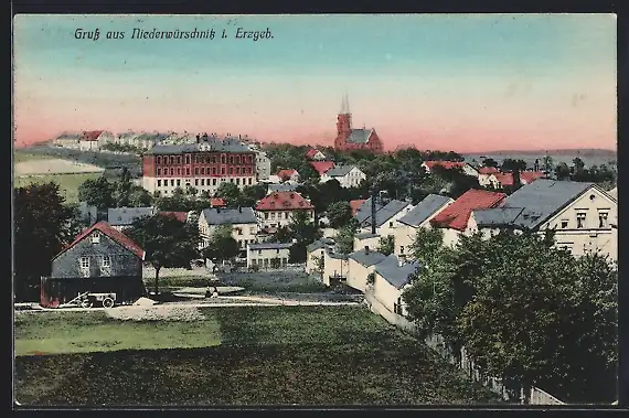 AK Niederwürschnitz /Erzgeb., Ortsansicht mit Feldern u. Kirche aus der Vogelschau