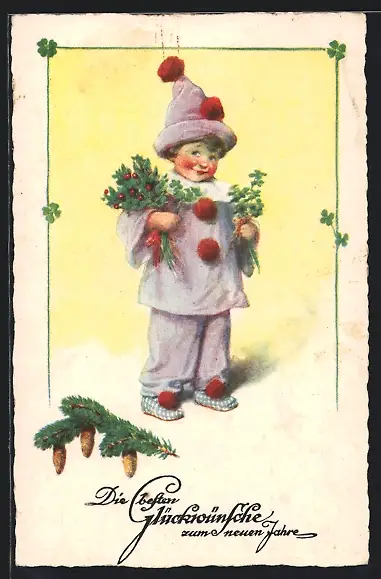 AK Niedlicher Harlekin mit Beerenzweigen in den Händen, Neujahrsgruss