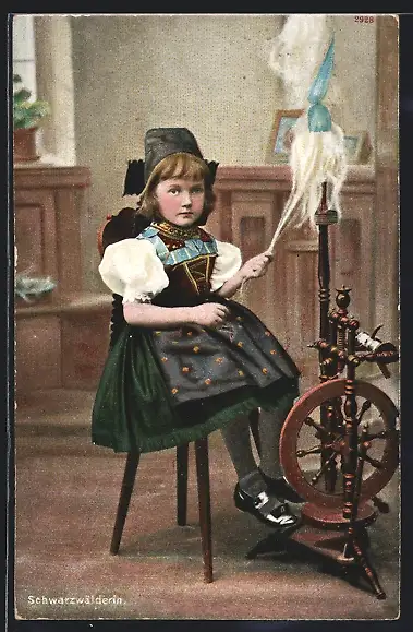 AK Niedliches Mädchen in Schwarzwälder Tracht am Spinnrad sitzend