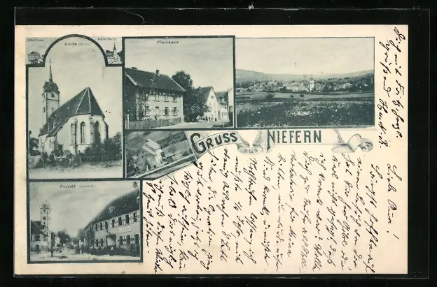 AK Niefern, Gasthaus, Kirche, Pfarrhaus