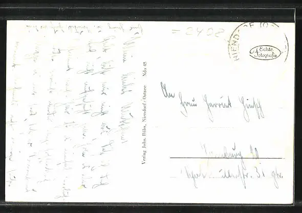 Personenbezogene Daten auf der Rückseite der Karte wurden durch blauen Textmarker unkenntlich gemacht. Die blauen Stellen sind auf die Vorderseite durchgeweicht und wirken sich negativ auf das Postkartenfoto aus