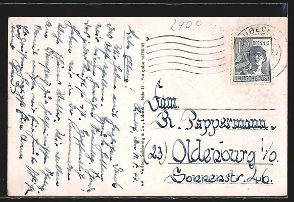 alte Ansichtskarte, gelaufen 1947, Eckknick oben li. u. unten re., Einriss re. unten, guter Zustand