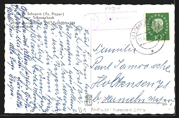Personenbezogene Daten auf der Rückseite der Karte wurden durch blauen Textmarker unkenntlich gemacht. Die blauen Stellen sind auf die Vorderseite durchgeweicht und wirken sich negativ auf das Postkartenfoto aus