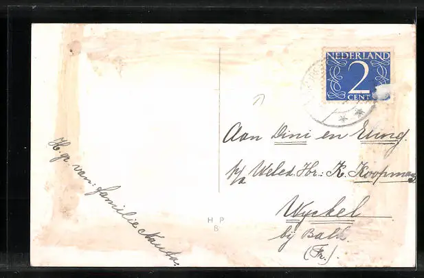 Personenbezogene Daten auf der Rückseite der Karte wurden durch blauen Textmarker unkenntlich gemacht. Die blauen Stellen sind auf die Vorderseite durchgeweicht und wirken sich negativ auf das Postkartenfoto aus