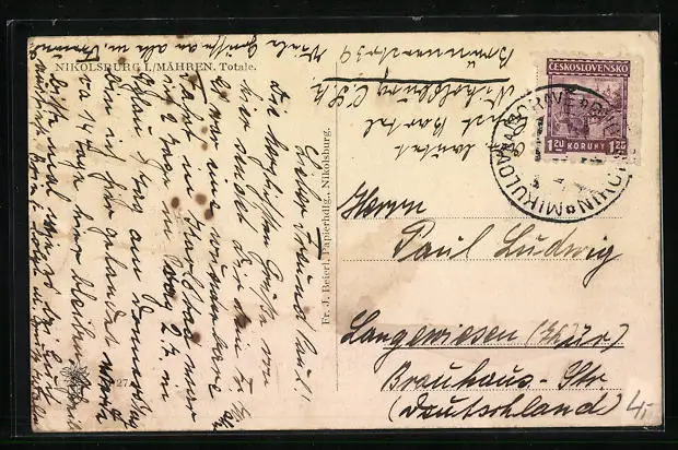 Personenbezogene Daten auf der Rückseite der Karte wurden durch blauen Textmarker unkenntlich gemacht. Die blauen Stellen sind auf die Vorderseite durchgeweicht und wirken sich negativ auf das Postkartenfoto aus