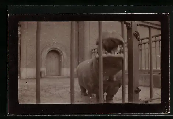 AK Nilpferd mit geöffnetem Maul hinter Gittern