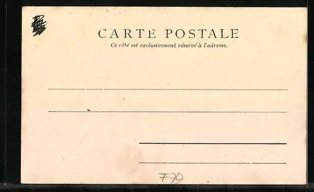 Personenbezogene Daten auf der Rückseite der Karte wurden durch blauen Textmarker unkenntlich gemacht. Die blauen Stellen sind auf die Vorderseite durchgeweicht und wirken sich negativ auf das Postkartenfoto aus