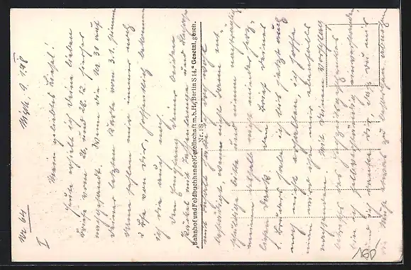 Personenbezogene Daten auf der Rückseite der Karte wurden durch blauen Textmarker unkenntlich gemacht. Die blauen Stellen sind auf die Vorderseite durchgeweicht und wirken sich negativ auf das Postkartenfoto aus