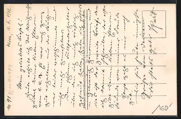 Personenbezogene Daten auf der Rückseite der Karte wurden durch blauen Textmarker unkenntlich gemacht. Die blauen Stellen sind auf die Vorderseite durchgeweicht und wirken sich negativ auf das Postkartenfoto aus
