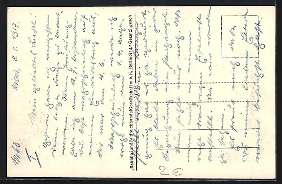 Personenbezogene Daten auf der Rückseite der Karte wurden durch blauen Textmarker unkenntlich gemacht. Die blauen Stellen sind auf die Vorderseite durchgeweicht und wirken sich negativ auf das Postkartenfoto aus