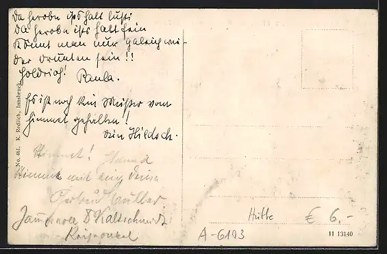 Personenbezogene Daten auf der Rückseite der Karte wurden durch blauen Textmarker unkenntlich gemacht. Die blauen Stellen sind auf die Vorderseite durchgeweicht und wirken sich negativ auf das Postkartenfoto aus