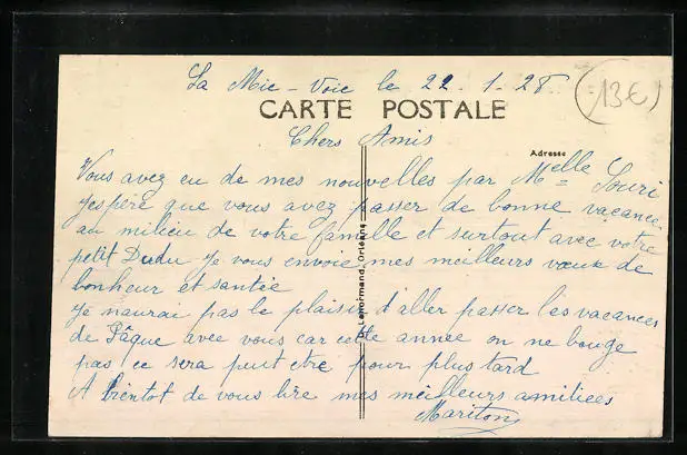 Personenbezogene Daten auf der Rückseite der Karte wurden durch blauen Textmarker unkenntlich gemacht. Die blauen Stellen sind auf die Vorderseite durchgeweicht und wirken sich negativ auf das Postkartenfoto aus